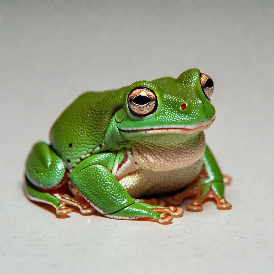 A vibrant green tree frog sits on a plain white surface. It has large orange-rimmed eyes, a white underbelly, and orange toes. The frog faces forward with a slightly open mouth.
