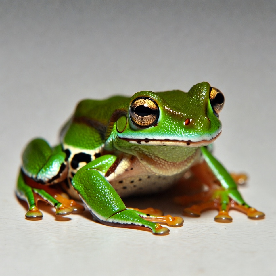 A vibrant green tree frog with golden eyes sits on a white background. It features black spots, orange toes, and a glossy skin texture. The frog faces forward with a slightly open mouth.