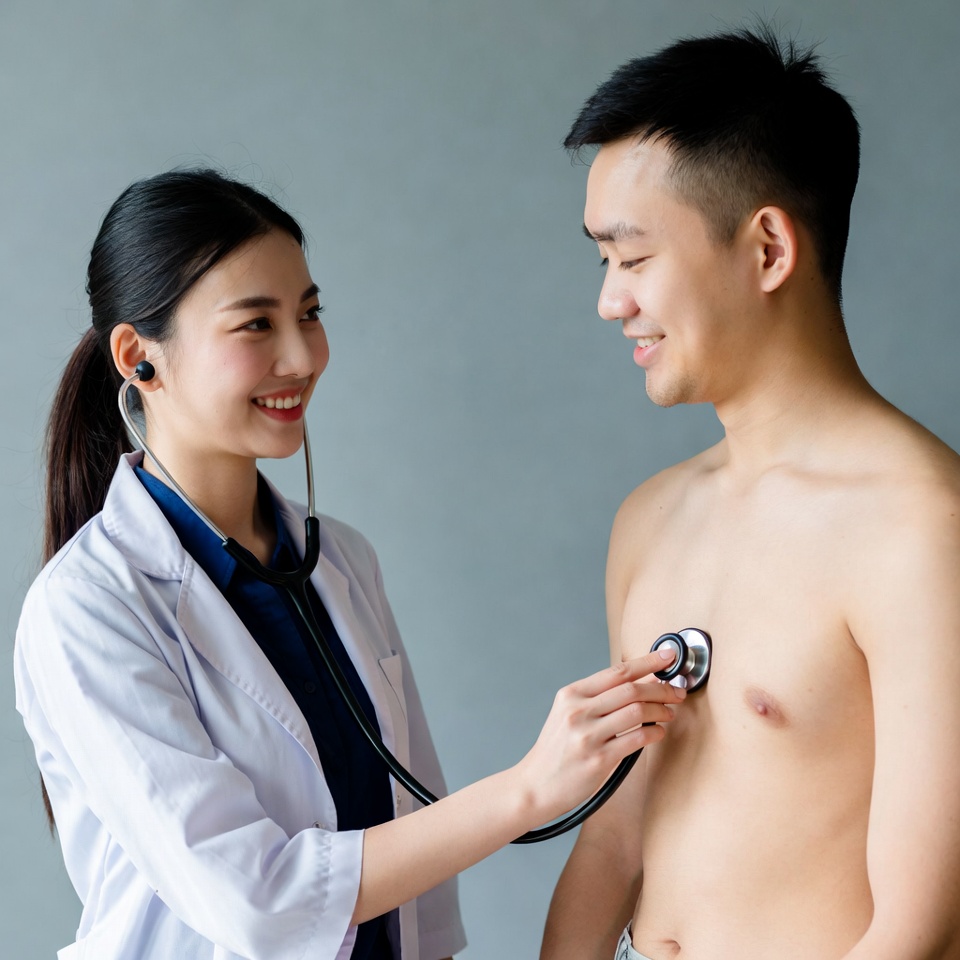 An Asian female nurse in a white lab coat and blue shirt uses a stethoscope to listen to the heartbeat of a shirtless Asian man. She has long dark hair in a ponytail and smiles while holding the stethoscope to his bare chest. Both stand against a plain gray background in a medical setting.