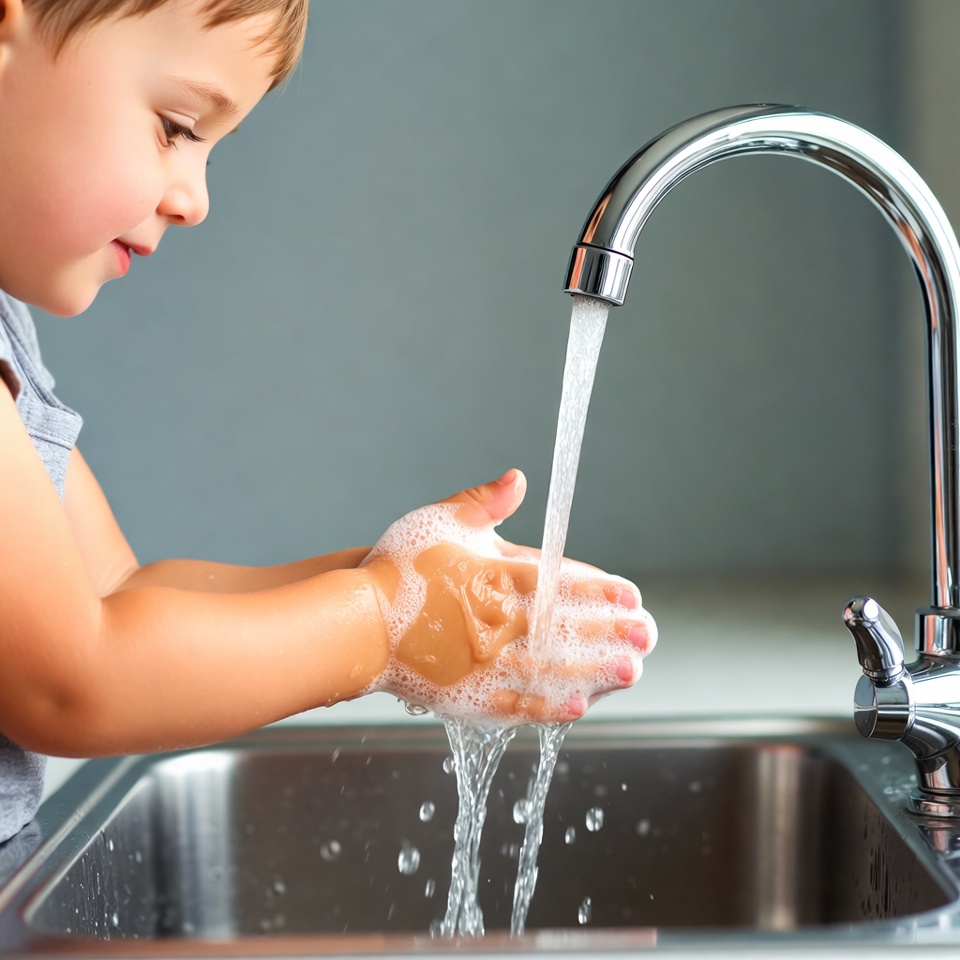 A young boy with light brown hair stands at a kitchen sink, washing his hands under running water from a chrome faucet. His small hands are covered in white soap suds as water flows over them into the stainless steel sink. He smiles happily while focusing on cleaning his hands in the bright kitchen.