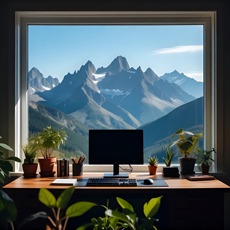 blue sky, books, computer monitor, home office, indoor plants, keyboard, mountain view, mountains, mouse, natural light, office setup, pen holder, plants, potted plants, snowy peaks, window, wooden desk, desk