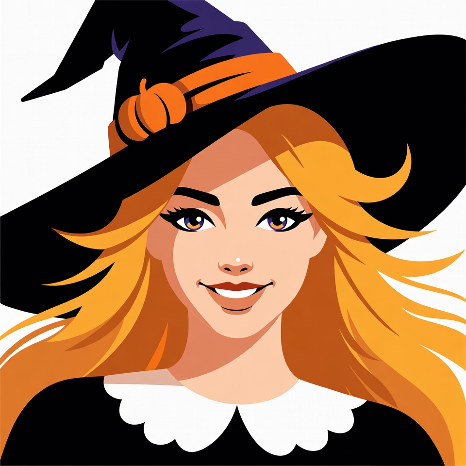 A cartoon illustration of a smiling blonde woman wearing a large black witch hat with an orange band and pumpkin accent. She has long wavy blonde hair, purple eyeshadow, and a black dress with white collar. The image is isolated on a white background.