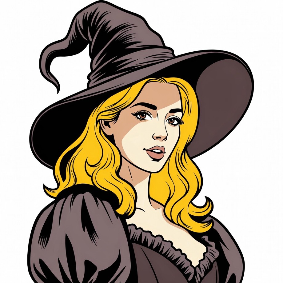 A cartoon illustration of a blonde woman dressed as a witch features long wavy yellow hair and a large black pointed hat. She wears a puffy-sleeved black dress with a low neckline and has a subtle smile on her face. The image is rendered in a bold line art style on an isolated white background.