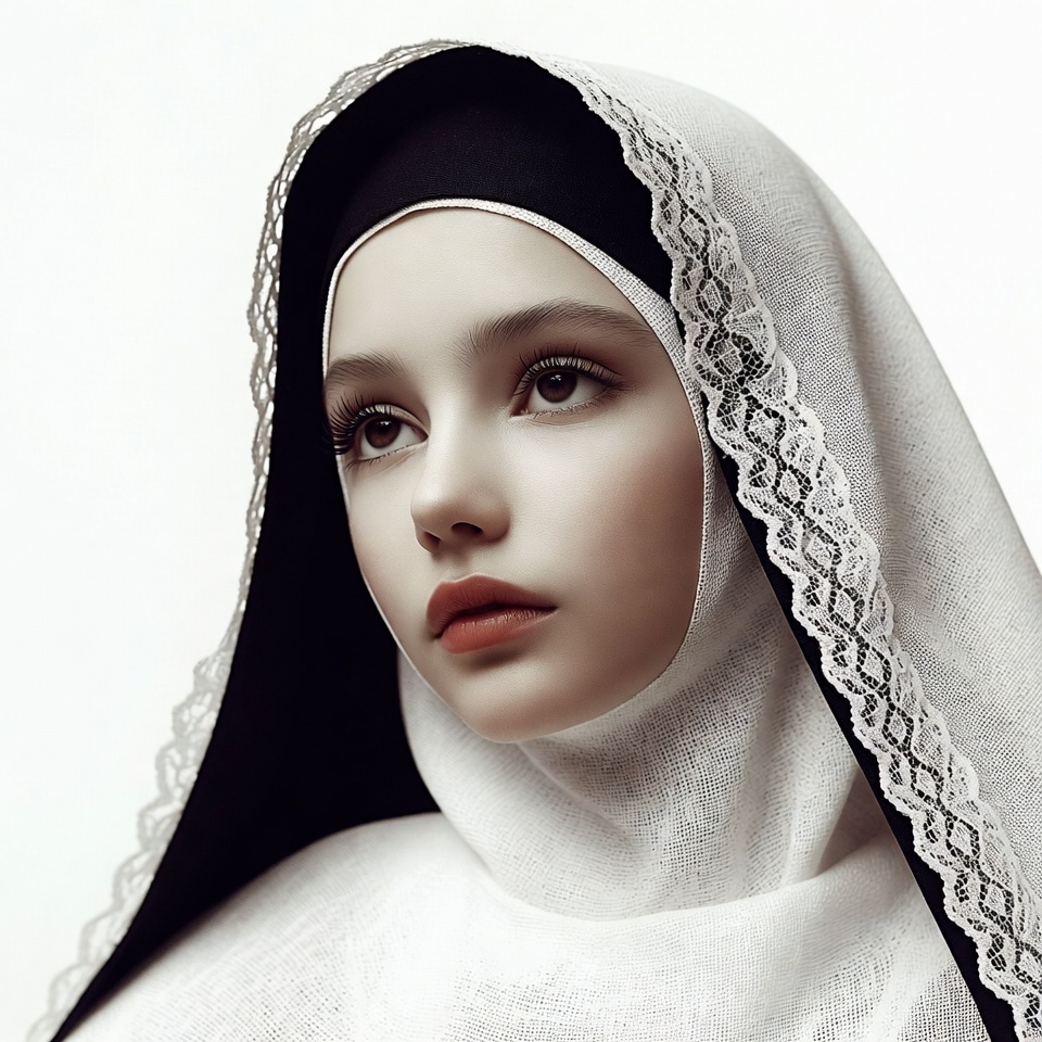 Asian, black veil, close-up, dark eyes, female, habit, isolated background, lace, pale skin, portrait, red lips, religious attire, serene expression, veil, white fabric, woman, young woman, nun