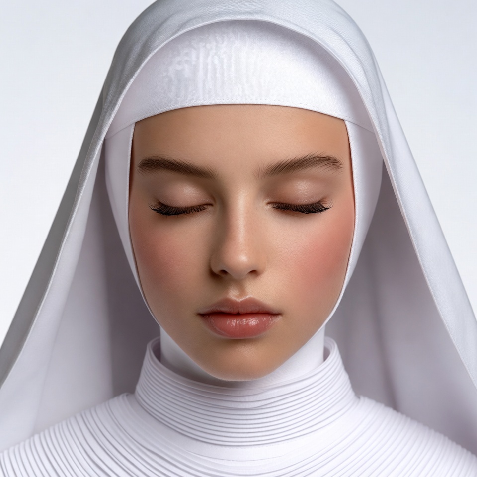A young woman with closed eyes and subtle makeup wears a traditional white nun's habit with a veil draped over her head. Her face features defined eyebrows, rosy cheeks, and glossy lips, centered against a plain white background. The high-collared garment has a textured, pleated design around the neck.