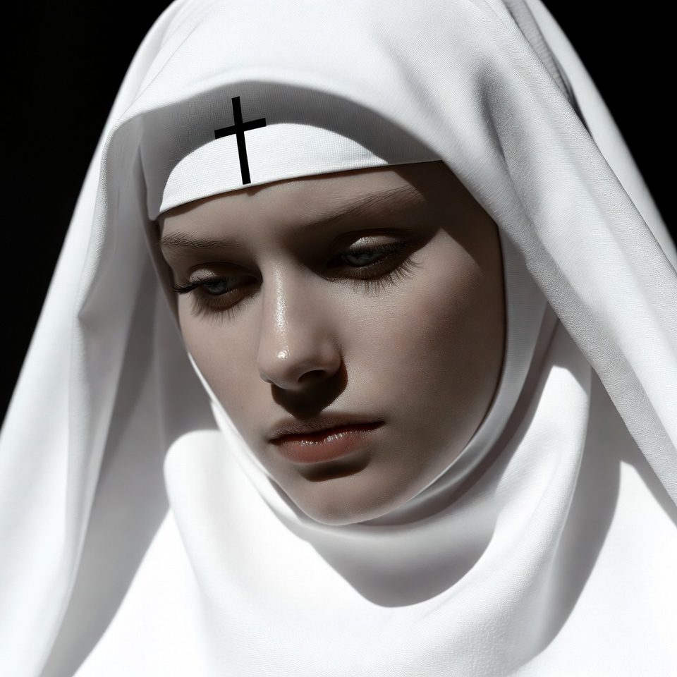 Catholic nun, White, black cross, close-up, dark background, fair skin, female, green eyes, habit, head covering, intense gaze, portrait, religious attire, serene face, solemn expression, traditional clothing, veil, white habit, woman, young woman, nun