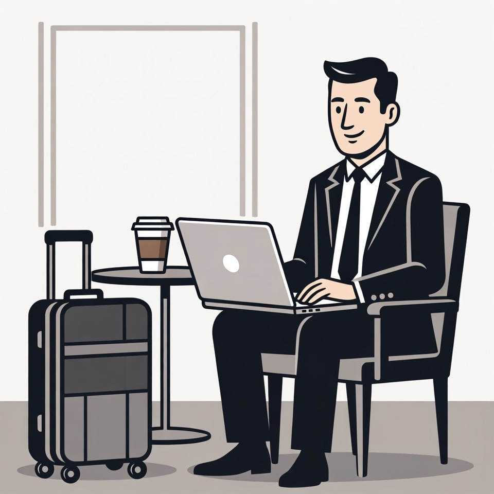 A smiling Asian businessman in a black suit sits at a small table working on a silver laptop. A coffee cup sits beside the laptop, and a gray suitcase stands next to the table. The scene features a simple line art illustration style with a neutral background.