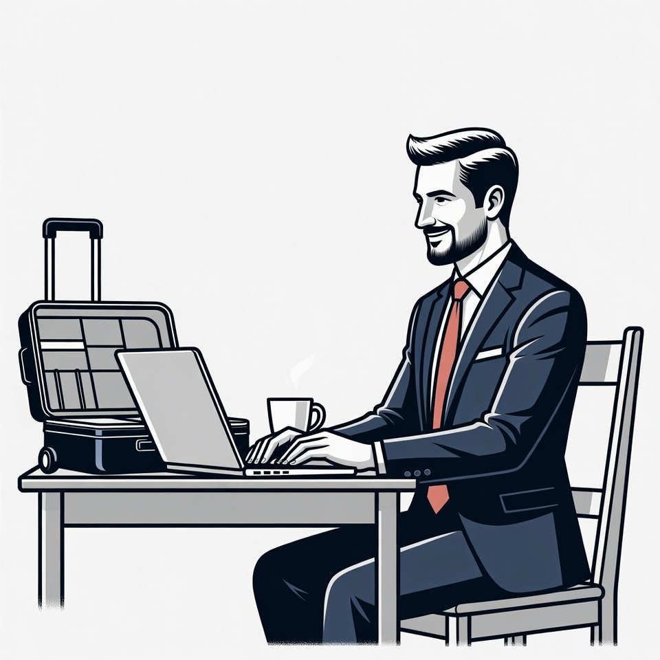 White, business, chair, clipart, coffee cup, computer, desk, illustration, isolated background, laptop, male, man, office, professional, red tie, smiling, suit, suitcase, travel, typing, vector art, working, businessman