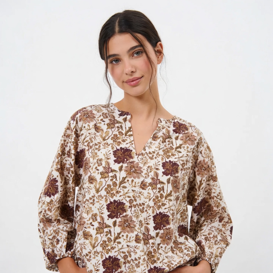 V-neck, beige blouse, brown flowers, brown hair, clothing, dark hair, fashion, female, floral blouse, headshot, isolated background, loose sleeves, portrait, smiling, white background, young woman, woman