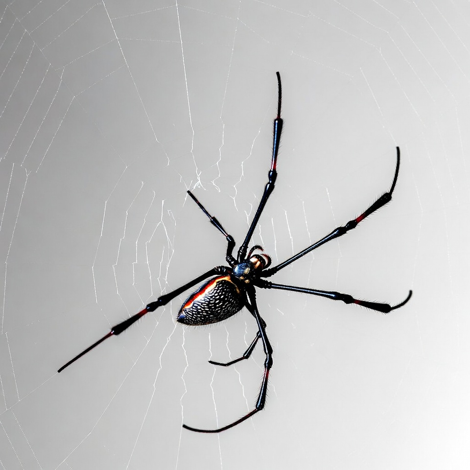 animal, arachnid, black spider, closeup, creepy, golden orb weaver, insect, isolated background, legs, long legs, macro, nature, orange markings, orb weaver, red abdomen, spider web, web, wildlife, spider