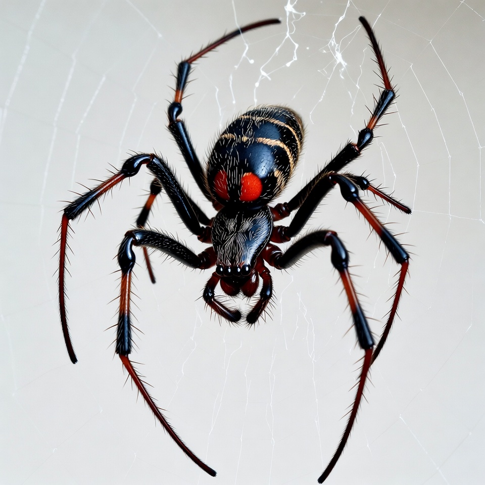 arachnid, black spider, creepy crawly, eight legs, fangs, insect, isolated background, long legs, macro photography, red eyes, spider web, striped abdomen, white web, wildlife, spider