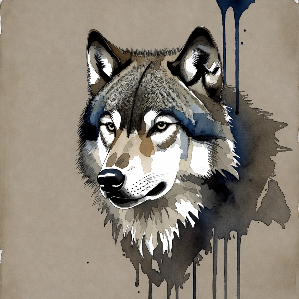 animal, art, beige background, blue paint, canine, digital art, eyes, face, fur, gray wolf, illustration, isolated background, paint drip, portrait, predator, splatter, watercolor, wild animal, wolf