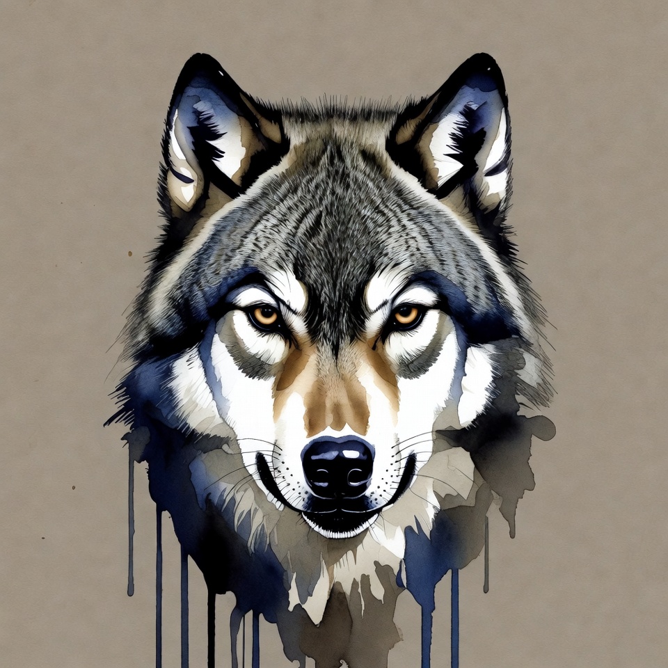 A detailed watercolor-style illustration of a gray wolf's face with intense yellow eyes and black nose. The fur features shades of gray, brown, and blue accents, with dripping paint effects around the head. It is set against a plain beige background.