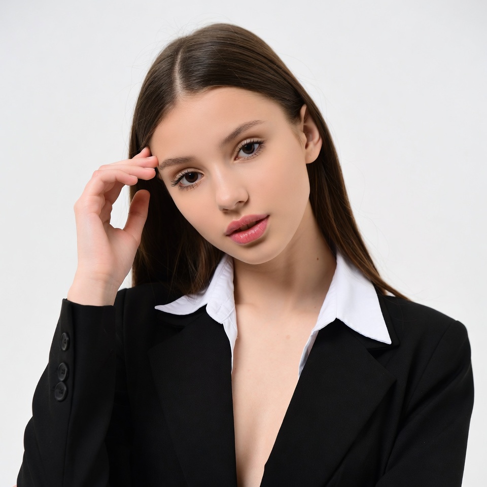 A young woman with long straight brown hair poses against a white background. She wears a black blazer over a white collared shirt with a deep V-neck and touches her forehead thoughtfully with her fingers. Her expression is calm with light makeup and pink lips.