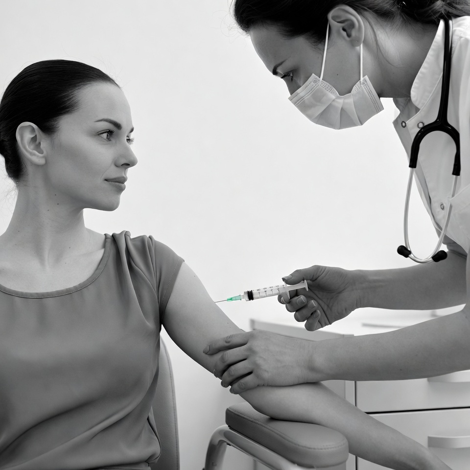 A nurse wearing a white uniform, mask, and stethoscope administers a vaccine injection into the upper arm of a seated woman. The woman, dressed in a gray top, looks calmly to the side as the nurse holds her arm steady. The scene occurs in a medical setting with a chair and cabinet nearby on a white background.