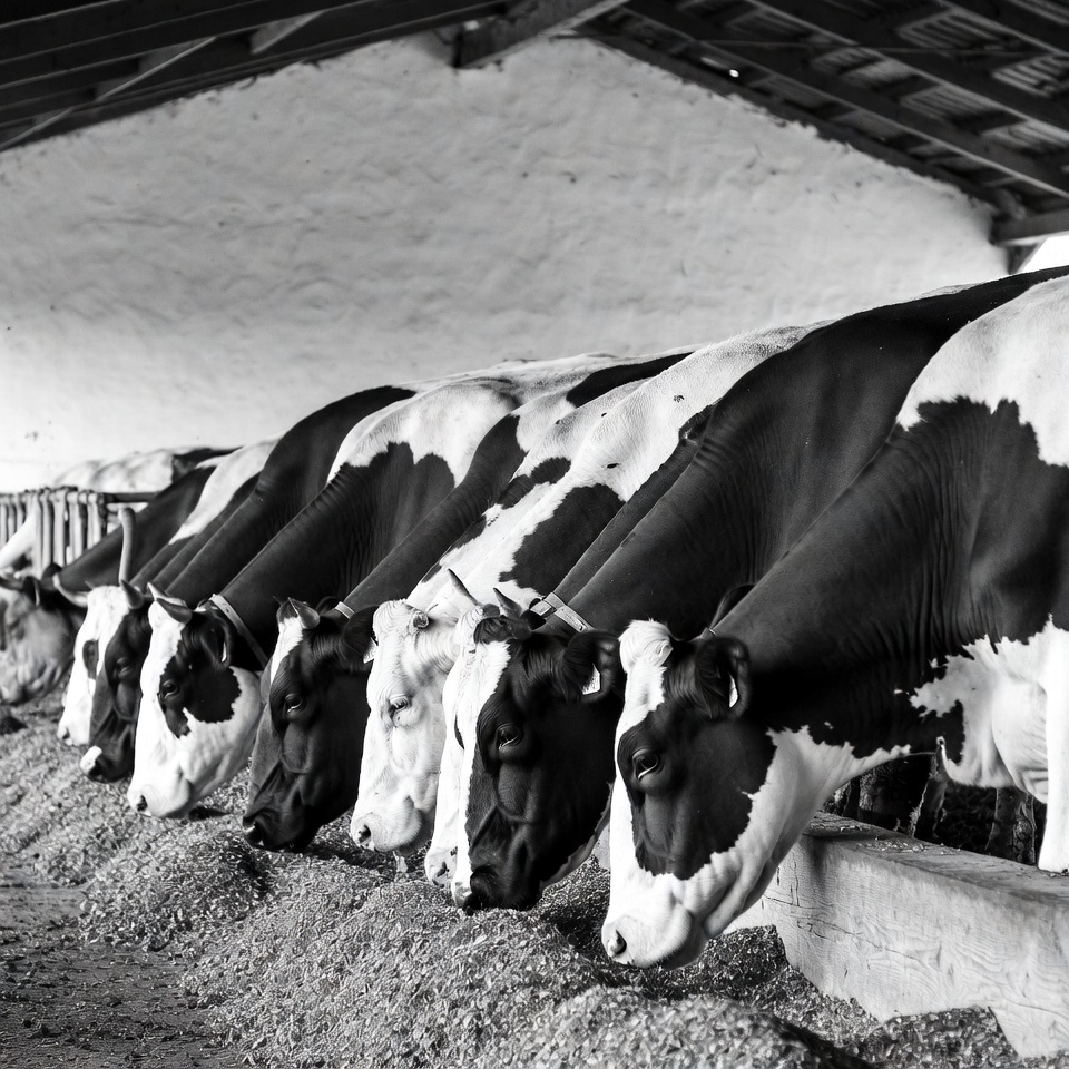 A row of black and white Holstein cows stands in a barn with white walls and a high ceiling. They eat from a long feed trough filled with grain. The black and white photograph captures their heads lined up closely together.