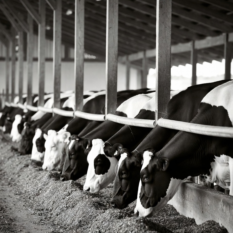 A row of black and white Holstein cows eats from a long trough in a spacious wooden barn. The black and white photograph captures their heads lowered over the feed with wooden beams and posts visible overhead. Gravel covers the barn floor beneath the feeding area.