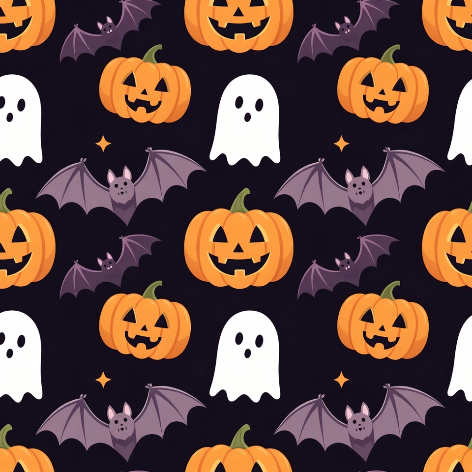 A colorful Halloween-themed seamless pattern features carved pumpkins with glowing faces, friendly ghosts, bats with outstretched wings, and sparkling stars. The elements are arranged on a dark purple background in a repeating design. Pumpkins dominate with orange hues, complemented by white ghosts and black bats.