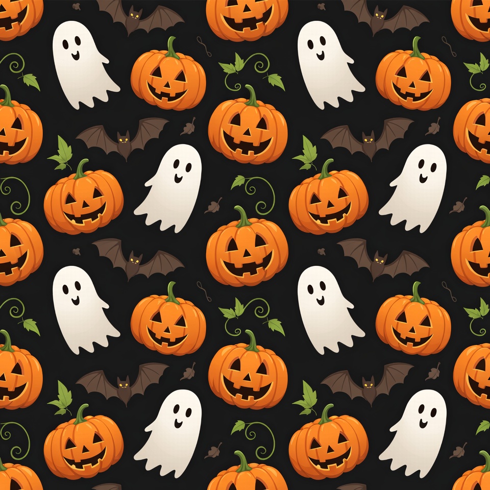 Halloween illustration, autumn pattern, bat, bats flying, cartoon pumpkin, carved pumpkin, clipart, cute Halloween, dark background, festive, friendly ghost, ghost, holiday graphic, jack-o-lantern, orange pumpkin, pumpkin, seamless pattern, smiling ghost, spooky, vector art, vines, white ghost, Halloween pattern