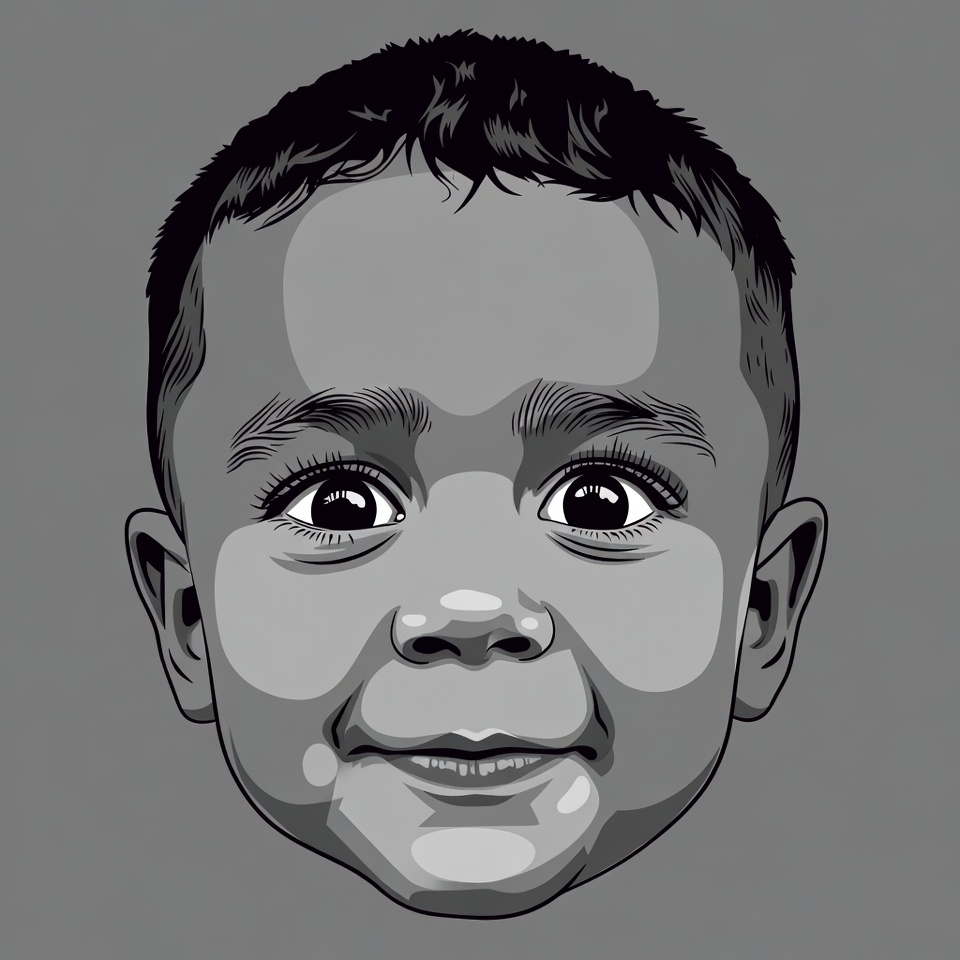 African-American, baby face, baby portrait, boy, chubby cheeks, clipart, curly hair, cute baby, digital art, grayscale illustration, happy baby, illustration, infant face, isolated background, portrait, smiling baby, smiling face, vector art, wide eyes, baby boy