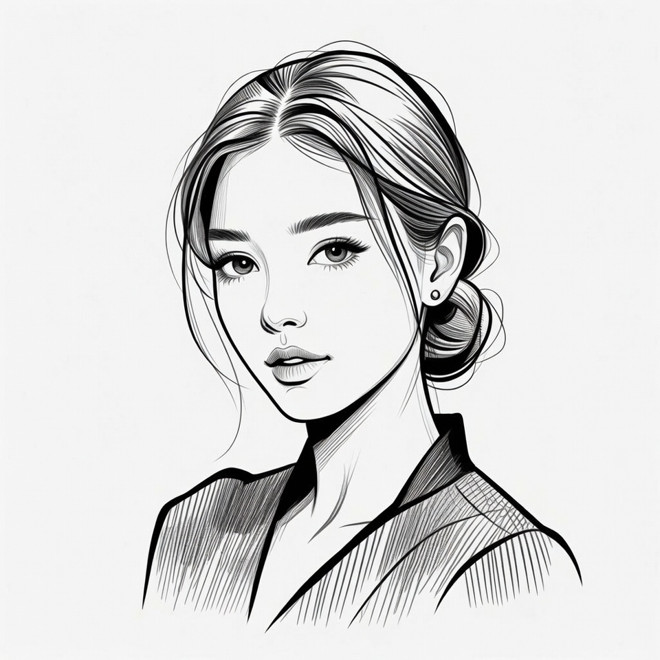 A detailed line art illustration of a young Asian woman with long hair styled in a loose bun. She has almond-shaped eyes, full lips, and small earrings, wearing a collared top. The portrait is rendered in black ink on a white background.