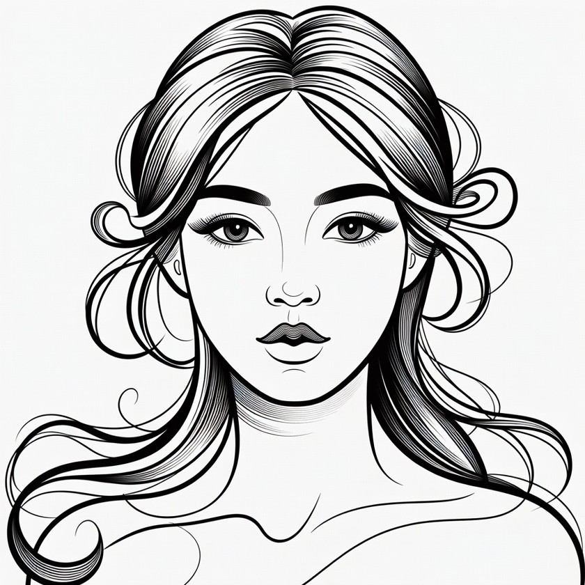 Asian, artistic portrait, beautiful face, black and white, detailed lines, drawing, elegant, eyes, face closeup, female, hairstyle, illustration, ink drawing, line art, lips, long hair, portrait, sketch, vector art, wavy hair, woman