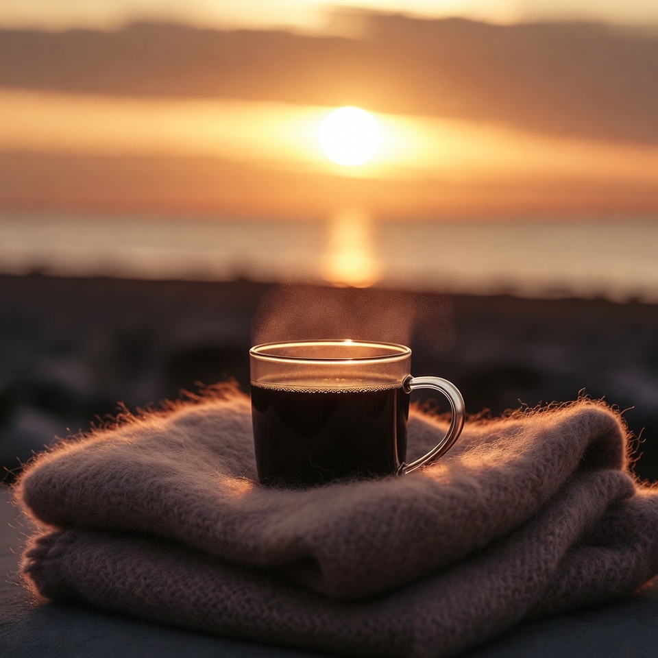 beach scene, beach sunset, clear glass, coffee steam, cozy drink, cozy sweater, dark coffee, dramatic sky, fuzzy fabric, glass mug, golden hour, hot coffee, morning coffee, ocean horizon, ocean sunset, orange sky, pebbled beach, pink sweater, seaside sunset, steam rising, steaming drink, sun reflection, sunset beach, warm beverage, coffee cup