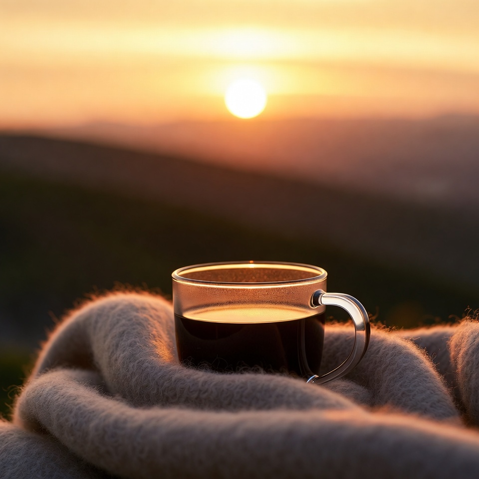 background hills, blanket, cozy, cup, drink, foreground mug, glass mug, golden hour, hills, hot beverage, landscape, morning, mug, nature, orange sky, outdoors, scenery, steamless coffee, sunrise, sunset, view, warm light, coffee