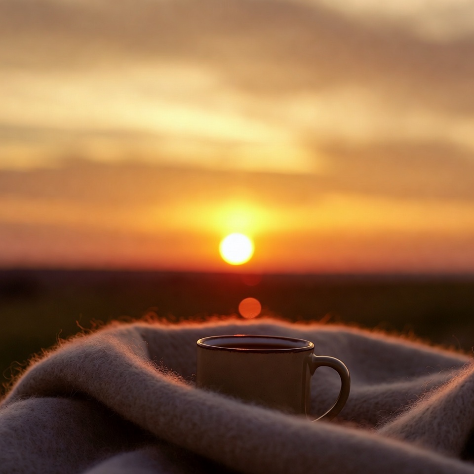 blanket, bokeh, close-up, clouds, coffee mug, cozy blanket, dusk, enamel mug, field, foreground, golden hour, horizon, hot drink, landscape, mug, nature, orange sunset, outdoors, serene landscape, sky, steaming mug, sun, tea mug, warm blanket, warm light, sunset