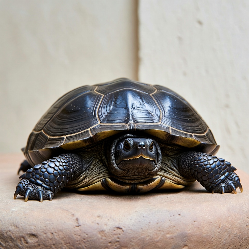 A black turtle with a shiny, patterned shell rests on a light brown stone surface. Its head is extended forward with dark eyes and a yellow mouth visible. The turtle's scaly legs are spread out beneath its body against a beige wall background.