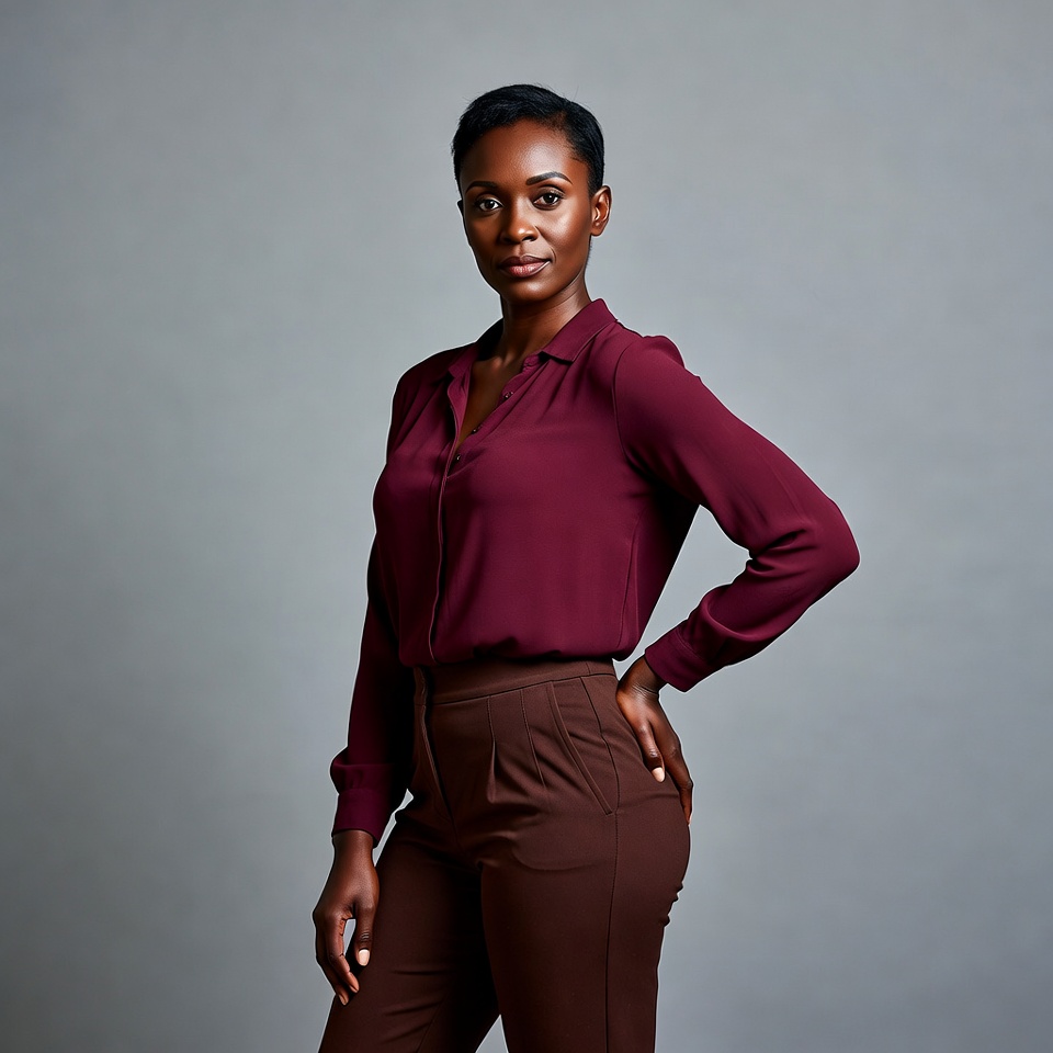 confident stance, dark skin, female, gray background, hand on hip, high-waisted pants, maroon blouse, professional attire, short hair, silk shirt, standing pose, studio portrait, trousers, woman, African-American woman