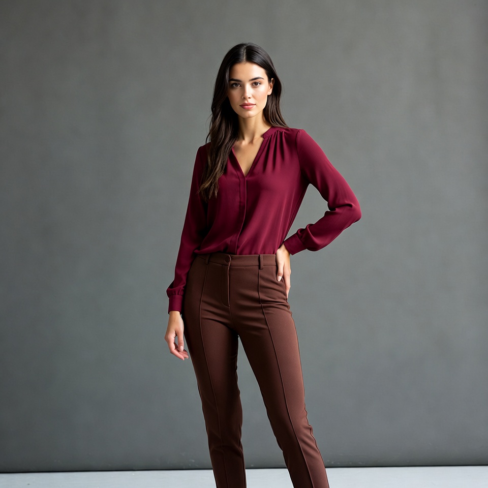 A woman with long dark hair stands confidently against a gray background. She wears a deep red long-sleeve button-up blouse with a V-neck and slim-fit brown pants. Her hand rests on her hip in a poised pose.