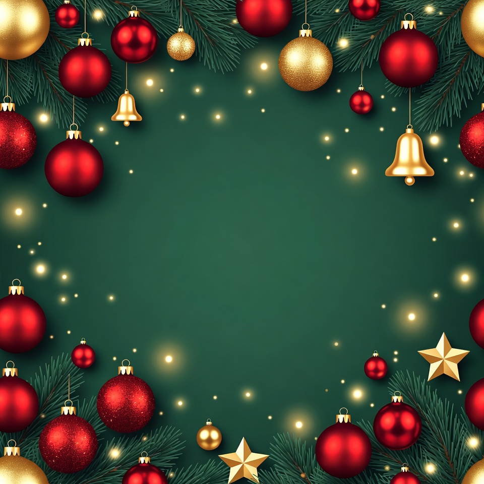 Red and gold Christmas baubles, bells, stars, and fir branches hang around a dark green background. Sparkling lights add a festive glow to the arrangement. The central area is empty for text overlay.