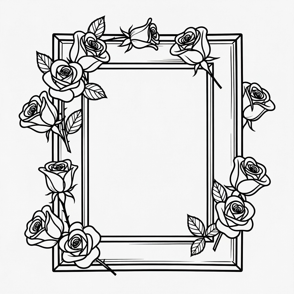 A black line art illustration features an ornate rectangular frame surrounded by blooming roses and leaves. The frame has an empty white space in the center. Detailed stems and petals adorn the border in a symmetrical design.