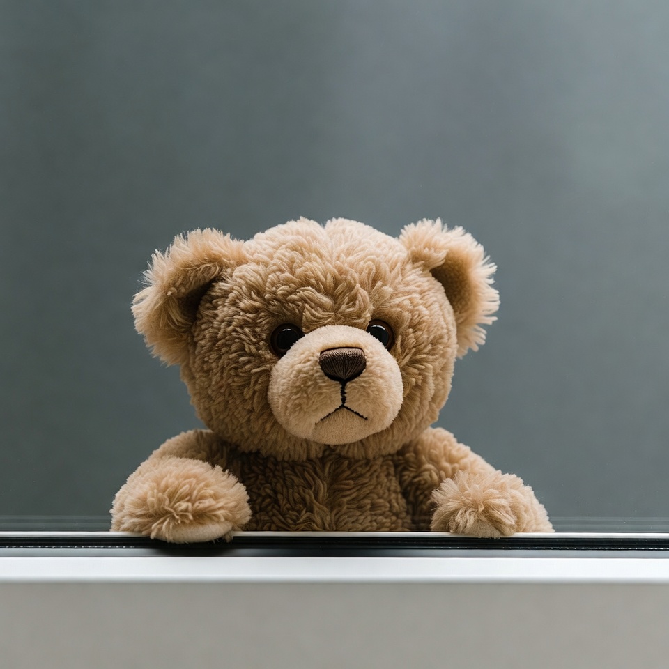 A fluffy brown teddy bear with big eyes peers over a white windowsill. It rests its paws on the sill against a gray background. The bear has a cute, slightly sad expression.
