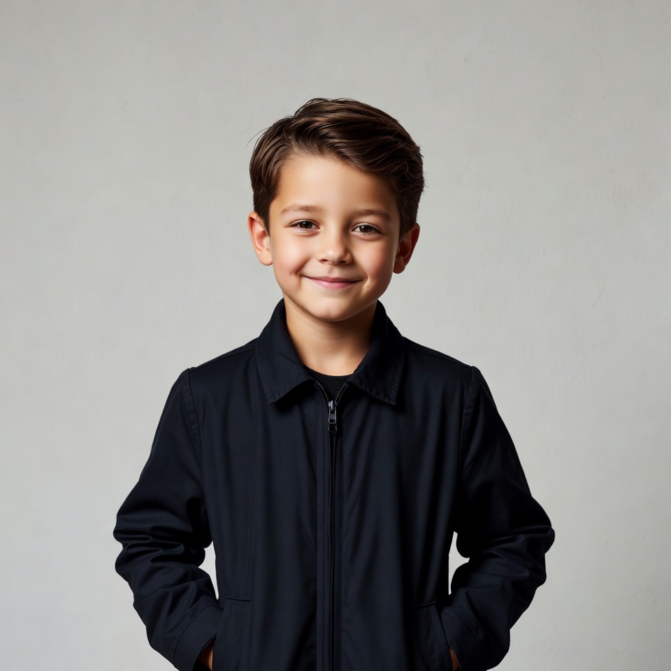 A young boy with short brown hair stands smiling against a plain white background. He wears a black zip-up jacket with hands in the pockets and a collared shirt underneath. His expression is cheerful with bright eyes.