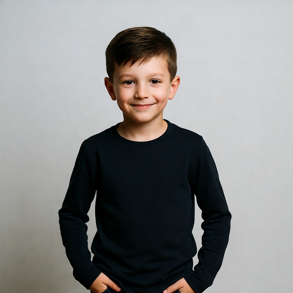 A young boy with short brown hair stands smiling against a plain white background. He wears a long-sleeved black sweater with hands in pockets. His expression is cheerful with bright eyes.