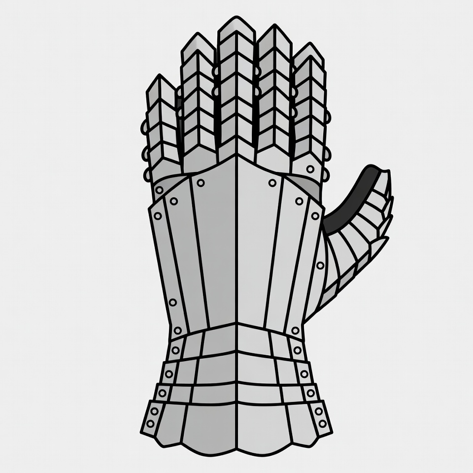 armored glove, clipart, fantasy armor, gauntlet hand, historical armor, illustration, isolated background, line art, medieval armor, metal glove, plate armor, rivets, spikes, steel armor, vector art, warrior glove, white background, knight gauntlet