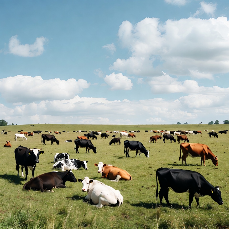 A large herd of black, white, and brown cows grazes on a lush green field under a bright blue sky with scattered white clouds. The cows are spread across the expansive pasture, some standing and others lying down. Gentle hills and distant trees frame the serene rural landscape.