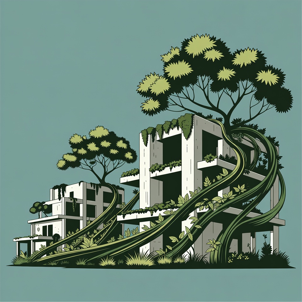 abandoned buildings, environmental overgrowth, futuristic ruins, green foliage, moss, nature reclaiming, overgrown vines, plants on buildings, post-apocalyptic art, teal background, trees, urban decay, vine-covered structures, white architecture, illustration