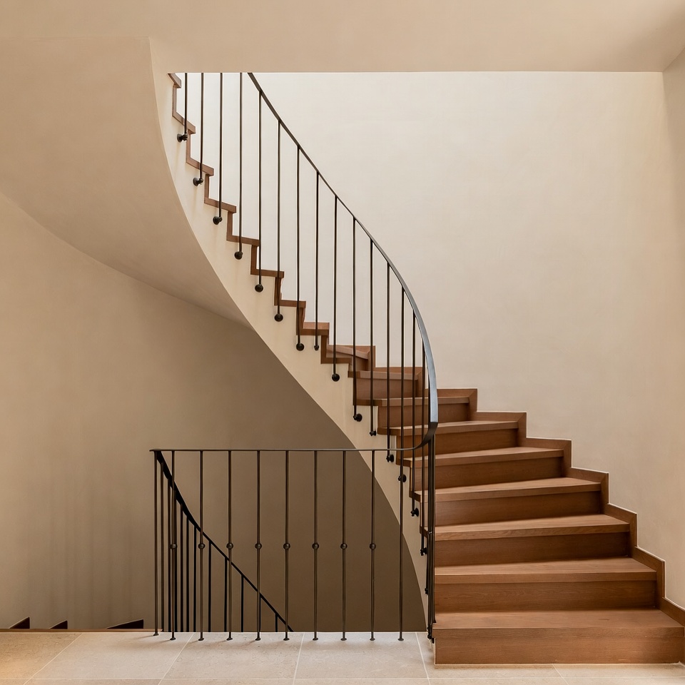 architecture, black railing, building interior, curved stairs, helical staircase, home decor, interior design, iron railing, luxury home, modern architecture, staircase, stairs, white wall, wood treads, wooden stairs, spiral staircase