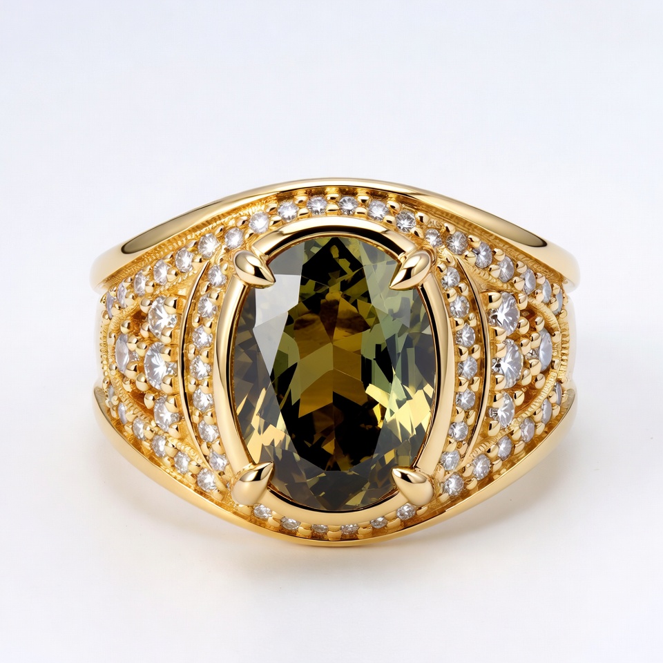 18k gold, cocktail ring, demantoid garnet, diamond ring, engagement ring, fine jewelry, gemstone ring, gold ring, green garnet, isolated background, jewelry, luxury jewelry, men's ring, ornate band, oval gemstone, pavé diamonds, solitaire ring, white diamonds, yellow gold, ring