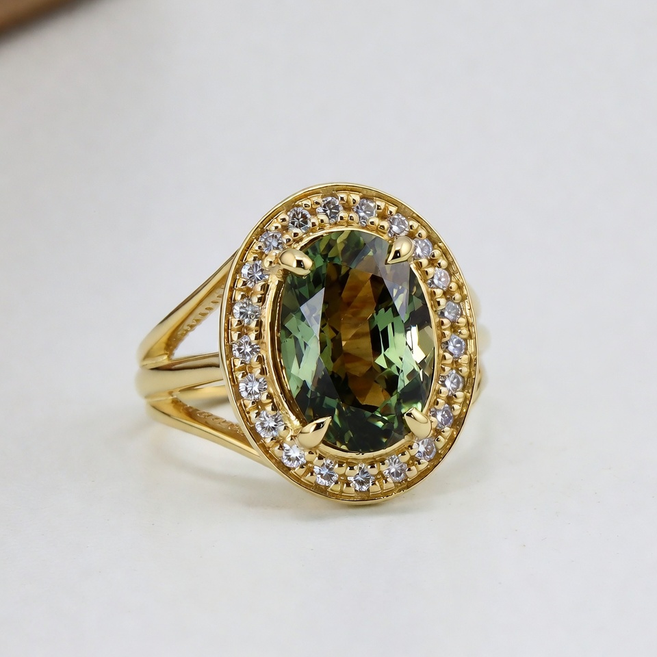 demantoid garnet, diamond accents, diamond halo, engagement ring, fine jewelry, gem ring, gold band, green gemstone, isolated background, jewelry, jewelry design, luxury jewelry, oval cut, pavé diamonds, precious stone, solitaire ring, split band, tsavorite garnet, women's ring, yellow gold, ring