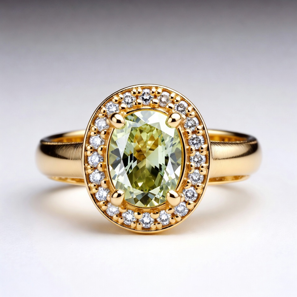 diamond halo, emerald cut, engagement ring, fancy ring, fine jewelry, gem ring, green gemstone, isolated, jewelry, luxury ring, oval cut, peridot ring, prong set, solitaire ring, white background, yellow gold, gold ring