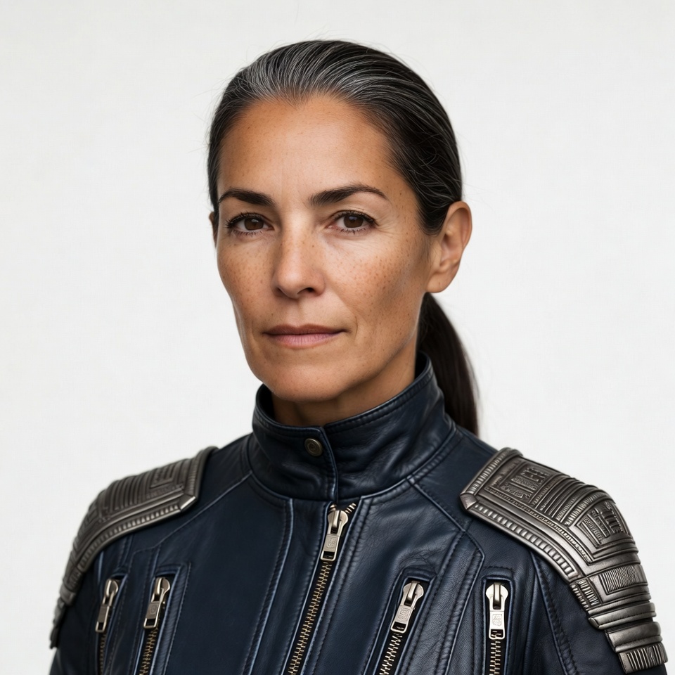 Multiracial, confident expression, female, freckles, futuristic jacket, gray hair, headshot, leather jacket, mature woman, metallic armor, ponytail, portrait, silver shoulders, white background, zippers, woman