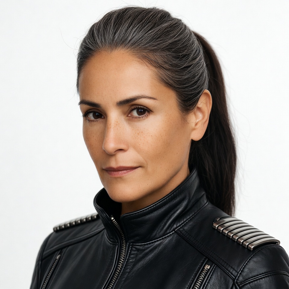 Latino, black leather jacket, closeup face, dark hair, female, gray streaks, headshot, high collar, neutral expression, ponytail, portrait, studs, stylish jacket, white background, woman
