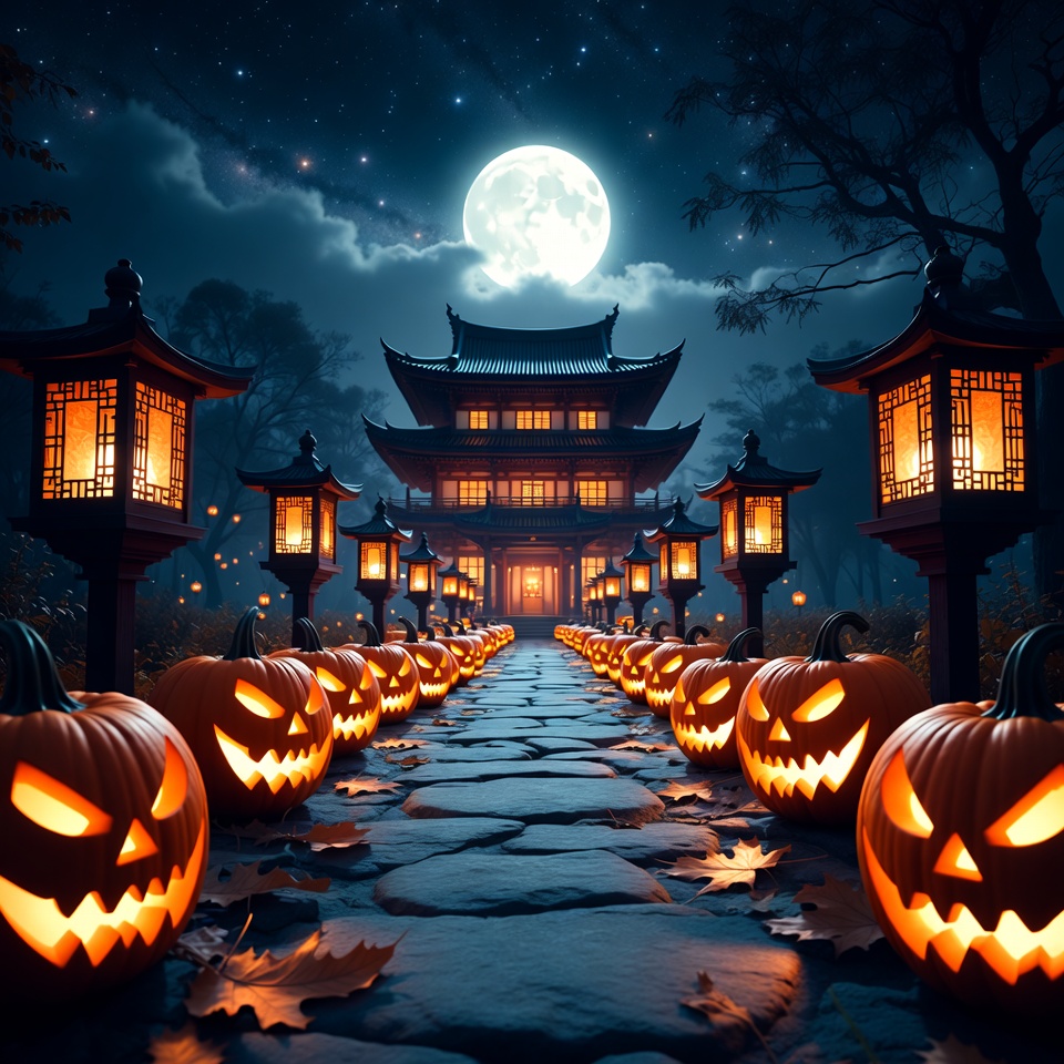 Halloween decoration, Japanese temple, autumn leaves, carved pumpkins, dark sky, digital art, eerie atmosphere, forest background, full moon, glowing lights, illustration, jack-o-lanterns, lanterns, night scene, orange pumpkins, pagoda, pumpkins, spooky, stone path, traditional architecture, twisted trees, Halloween
