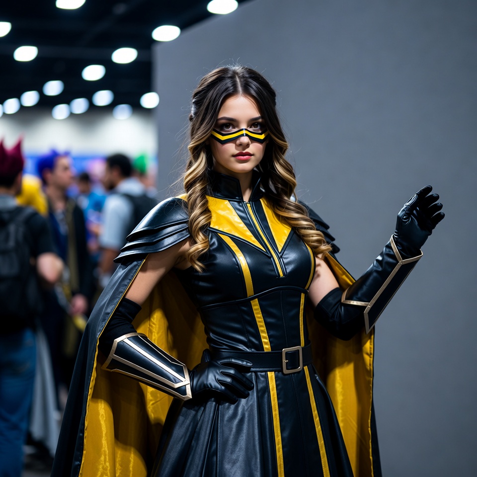 White, black costume, bright lights, brown hair, cape, comic con, convention, costume party, crowd background, detailed costume, fan convention, fantasy, female, geek culture, glasses, gloves, leather outfit, mask, posing, sci-fi, shoulder guards, superhero, wavy hair, woman, yellow accents, cosplay