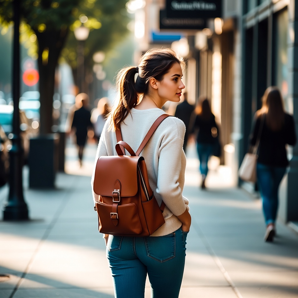 A young woman with dark hair in a ponytail walks down a sunny urban street wearing a white sweater, blue jeans, and a brown leather backpack. She looks over her shoulder with a subtle expression while blurred pedestrians and buildings line the sidewalk. Street lamps, trees, and shop signs are visible in the background.