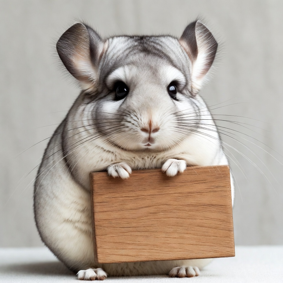 A fluffy gray chinchilla sits on a white background holding a blank wooden sign with its front paws. The chinchilla has large expressive eyes, soft fur, and rounded cheeks. Its paws grip the rectangular wooden board firmly.